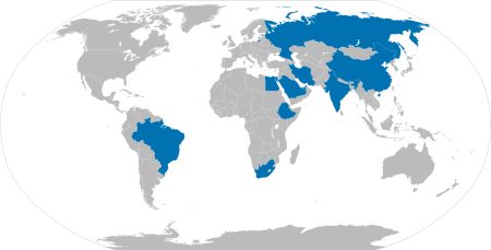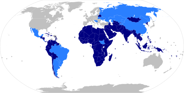 De Non-Aligned Movement (Beweging van Niet-Gebonden Landen (licht blauw: observator status))
